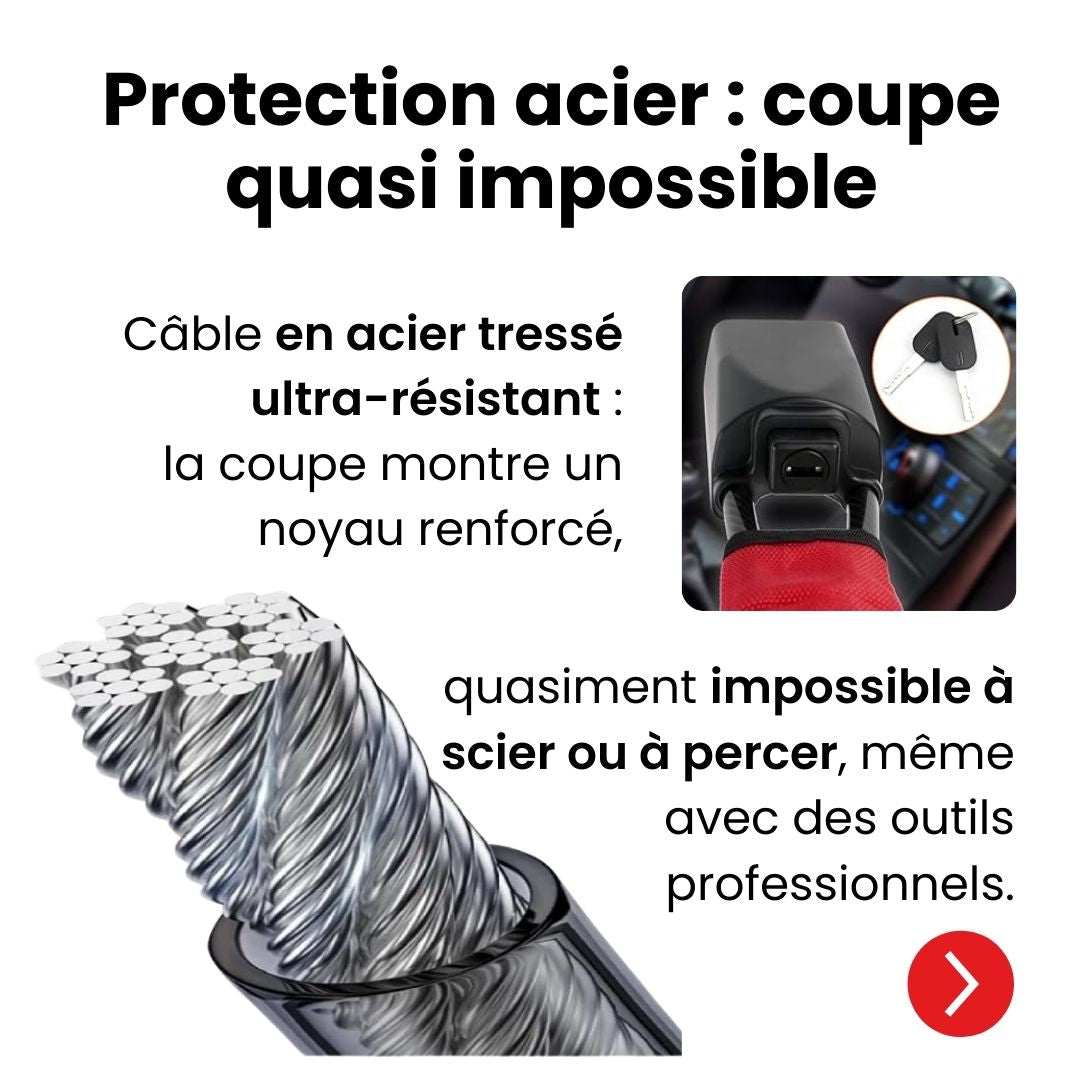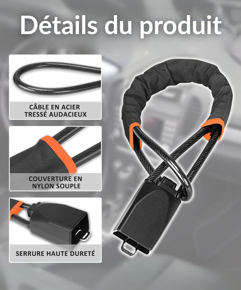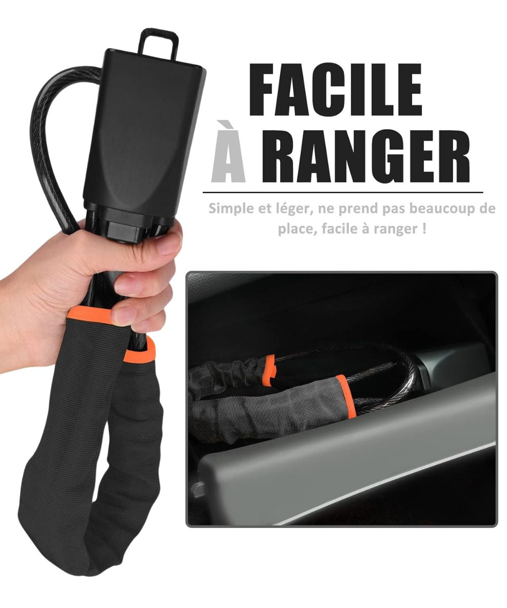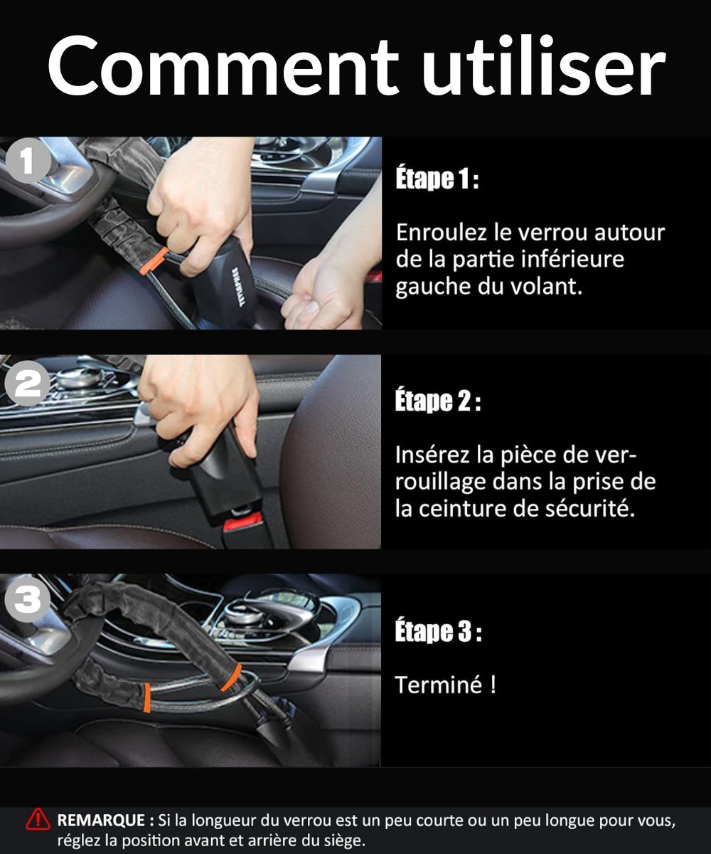 يتم تأمين القفل في بضع ثوانٍ، دون أي أداة. يكفي وضع قفل المقود وتثبيته في حزام الأمان للمركبة. تعزز هذه النقطة من الأمان من خلال إنشاء تثبيت مزدوج قوي، يصعب تجاوزه.