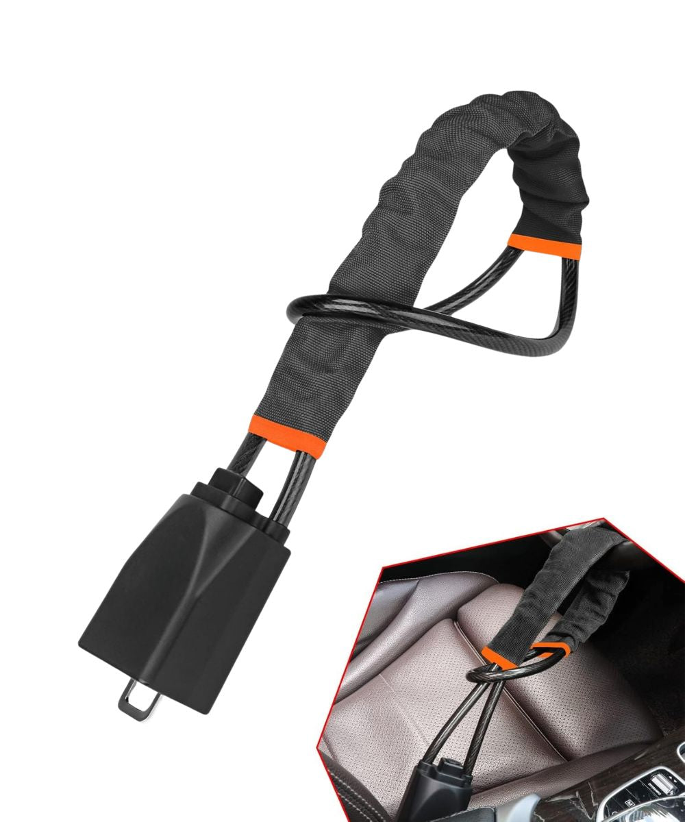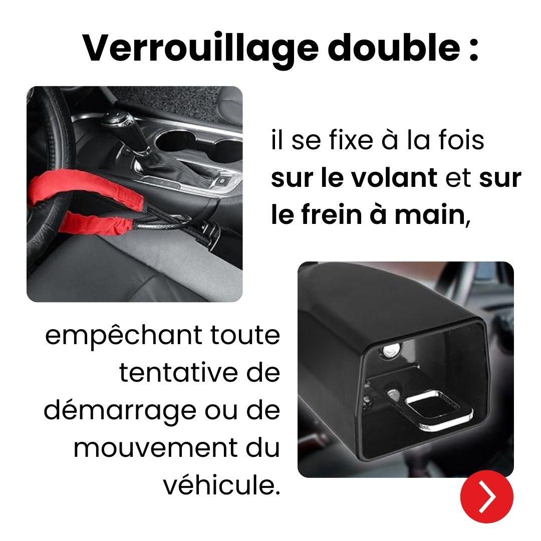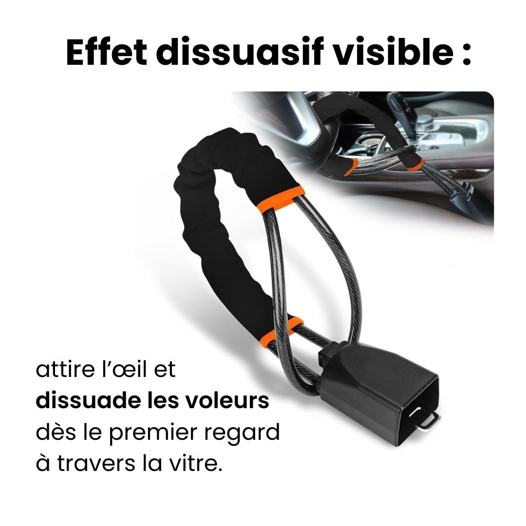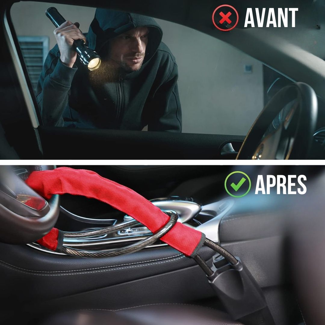 يتم تأمين القفل في بضع ثوانٍ، دون أي أداة. يكفي وضع قفل المقود وتثبيته في حزام الأمان للمركبة. تعزز هذه النقطة من الأمان من خلال إنشاء تثبيت مزدوج قوي، يصعب تجاوزه.